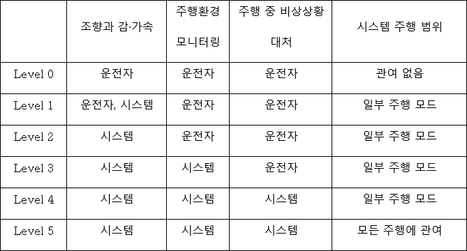 Table 1. SAE에서 정의한 자율주행 기술의 레벨