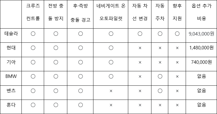- 옵션 추가 비용: 차량 구매에 있어 자율주행 기능들을 추가하면 발생하는 비용